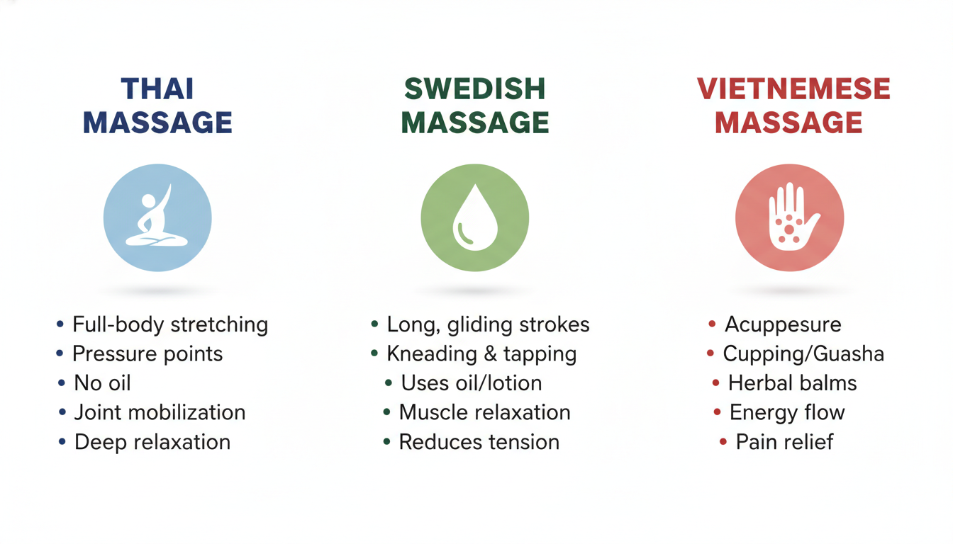 Thai massage is often described as lazy yoga. It involves a lot of stretching, pulling, and cracking of joints, usually performed on a floor mat without oil. Vietnamese massage, while also using pressure points, focuses more on muscle manipulation and circulation through rubbing and clapping. It is generally less acrobatic and more focused on deep tissue relief.
